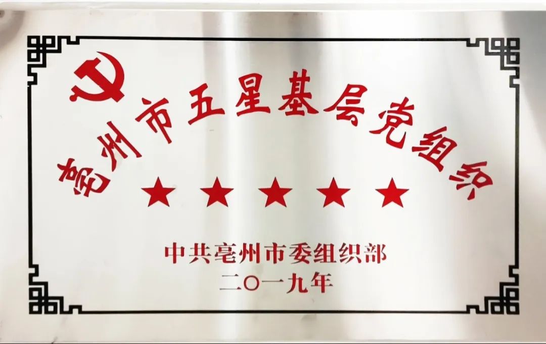 公司黨支部先后被授予全省“雙強六好”非公企業黨組織、“首批全省非公企業和社會組織黨建工作示范點”“亳州市五星基層黨組織”“亳州市先進黨組織”等榮譽。