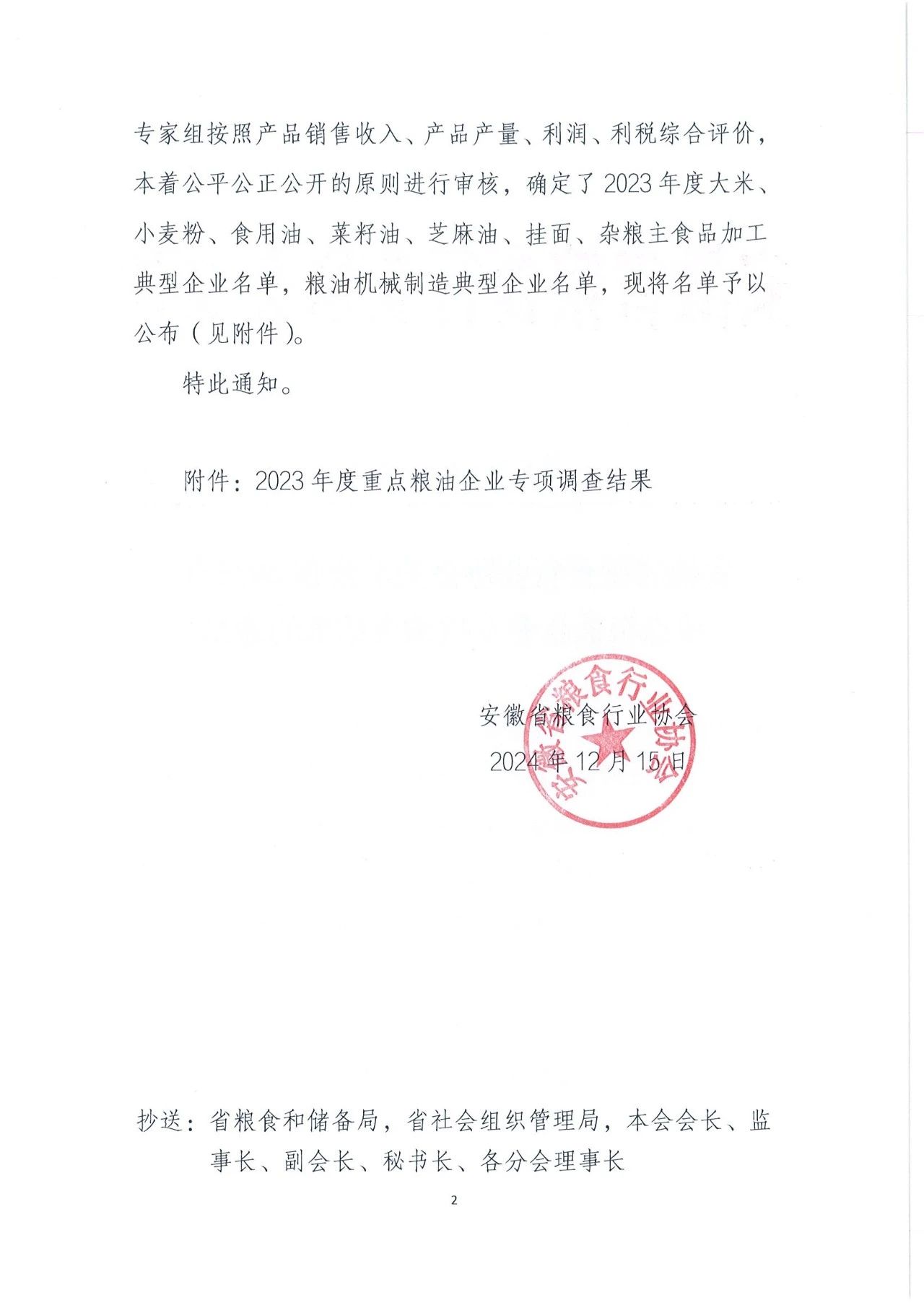 2024年12月15日,安徽省糧食行業協會下發《關于公布 2024年重點糧油企業專項調查結果的通知》。安徽正宇集團旗下正宇面業榮獲安徽省“小麥粉加工典型企業”榮譽稱號